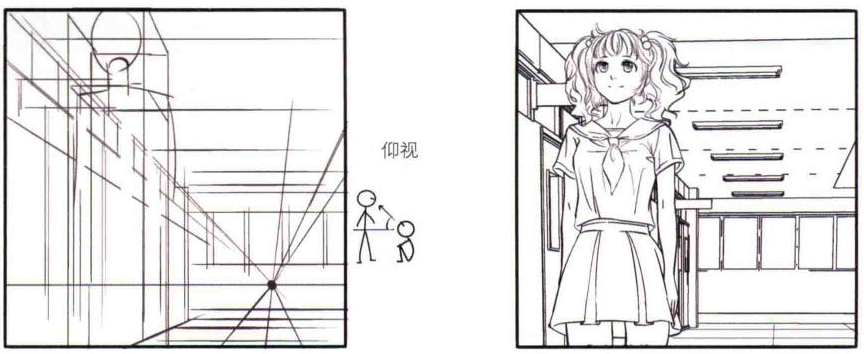 仰视的时候视平线位于比较低的位置,远处的背景天花板就可以看见比较多。