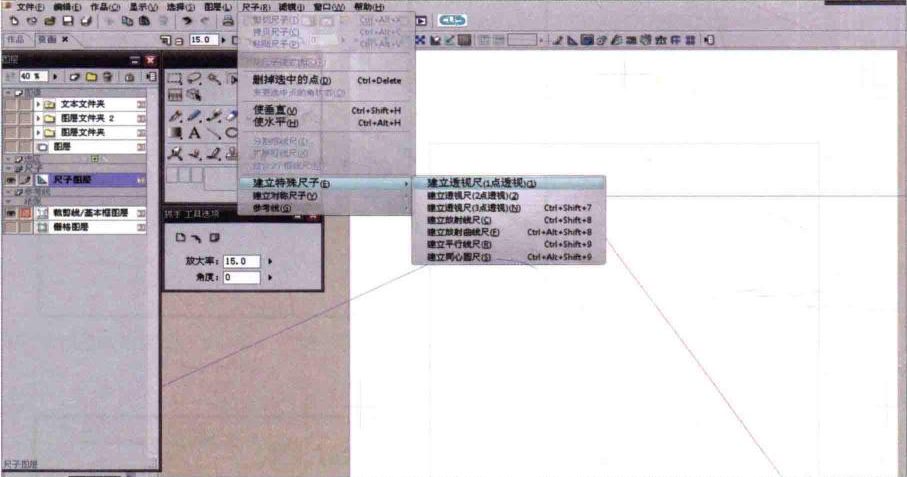 新建一个尺子图层,然后新建一个“1点透视尺”。根据视野调整视平线的高度和消失点的位置。