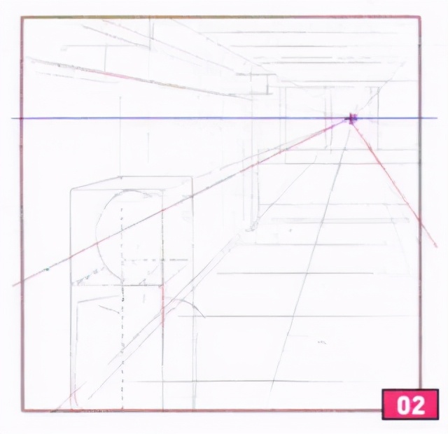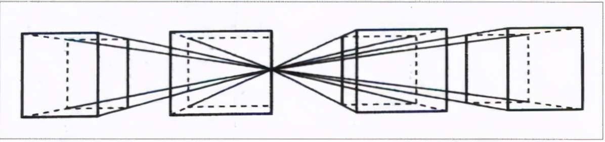 一点透视又叫平行透视,简单地说就是把眼睛所见的景物,投影在眼前的一个平面,然后在投射图形的后方找一点消失点,并让所有的视线集中到消失点上,如下图所示。