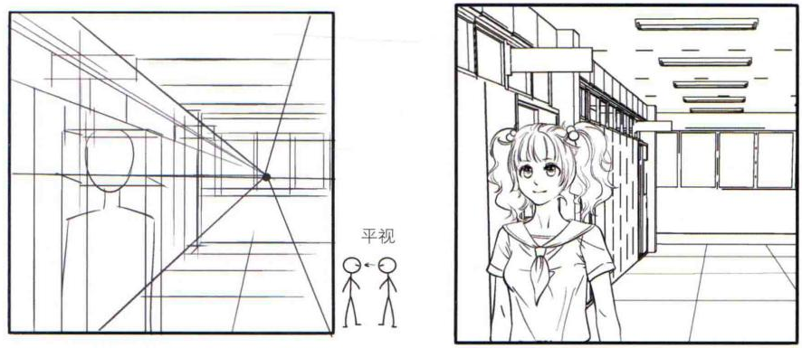 平视的时候,如果平视的对象身高差不多,基本上视平线也就相当于在对方的眼睛处。高点矮点主要看参照人物的身高。远处的背景天花板和地板各露一半。