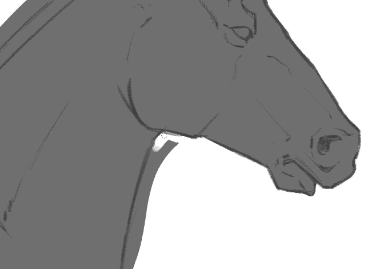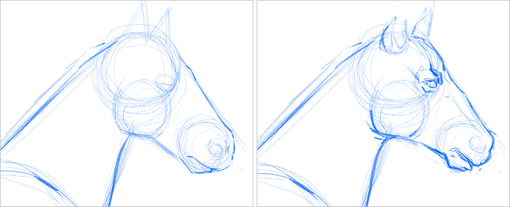 为了更好的描述头骨结构,我们在最大的圆(头顶)下面添加了另一个圆,放置了马头最具特点的部分--脸颊。这一重要细节为绘图增添了真实感。接下来,放置眼睛、鼻子和嘴。对于此特定步骤,准备参考板非常重要。
