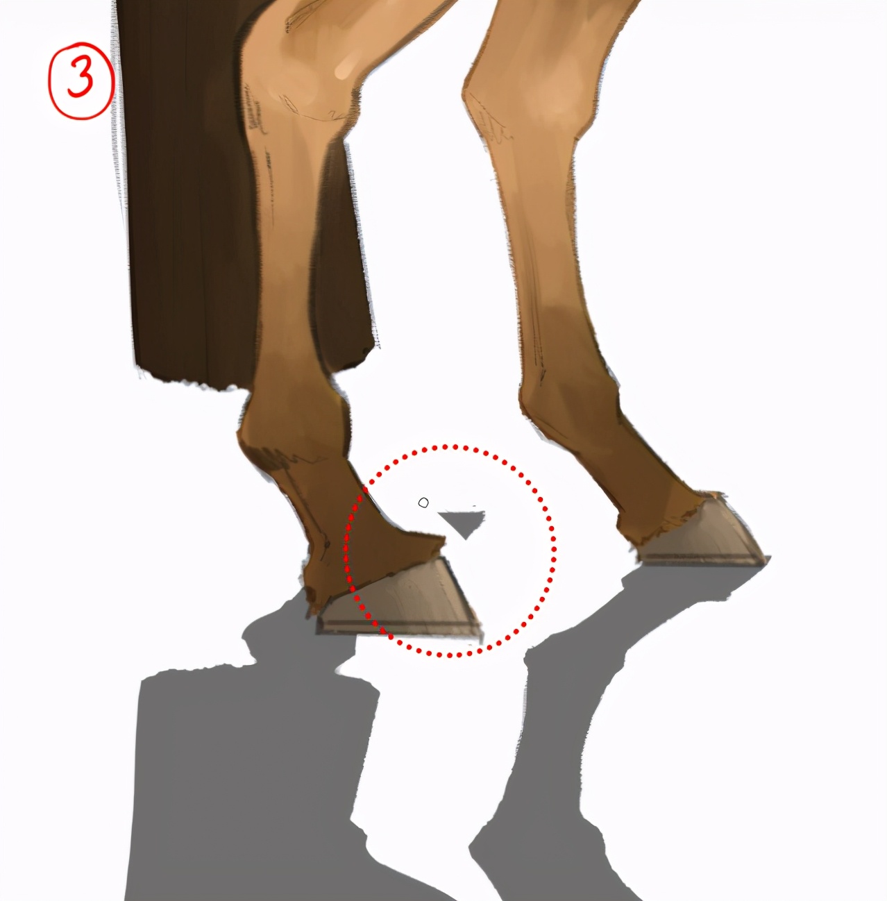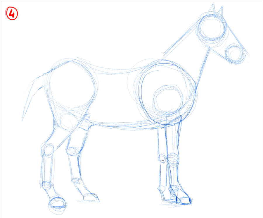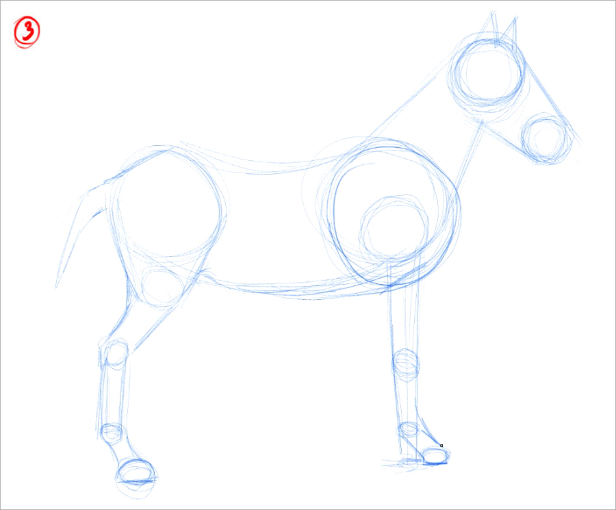 现在绘制一条腿。前面是两个对角线结束的,在关节上画一个矩形和几个圆就可以了,然后连接代表蹄子的椭圆形,所以更简单(3)。