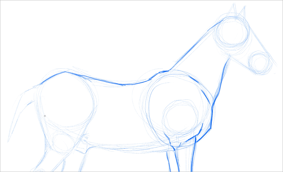 设置结构后,将以前绘制的所有线组合在一起,以绘制马的躯干形状。反映解剖结构,用粗线条来勾勒躯干的轮廓。