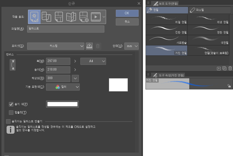 在CSP中打开新文件(文件>新>A4,水平,白色)铅笔工具用于草图粗铅笔选择(设置为蓝色)。