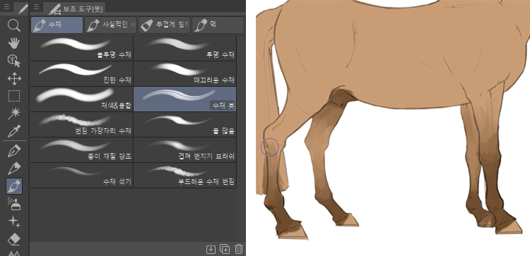 处理不同色调时,使用比毛发基本色更暗的色调,如下图所示。水彩笔使用。