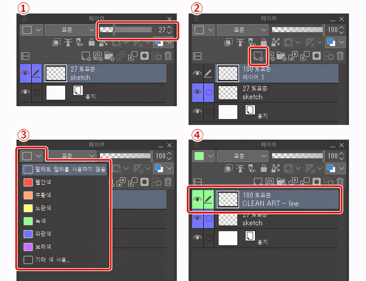 现在,图片已经准备好了,因此需要对线条进行修饰。首先,降低草绘层的不透明度,使其不刺眼。大约20-30%就足够了(1)。然后单击图像(2)中显示的按钮创建新层。配置的秘诀是为每个层赋予特定的颜色,以便快速区分(3)。最后,右键单击并将新层重命名为“CLEAN ART-line”(清理),这样您就可以知道哪些线条是经过修剪的(4)。
