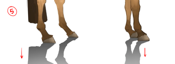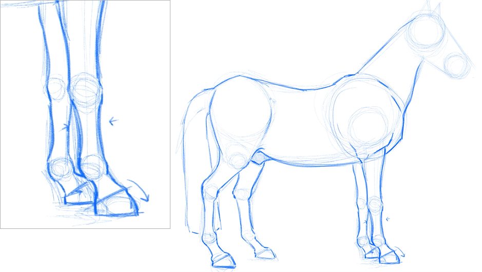 现在,我们可以更好地掌握腿。先前为直线的绘制线现在需要在关节之间(由下图中的箭头所示)稍微向内弯曲,从关节和蹄部向外弯曲。