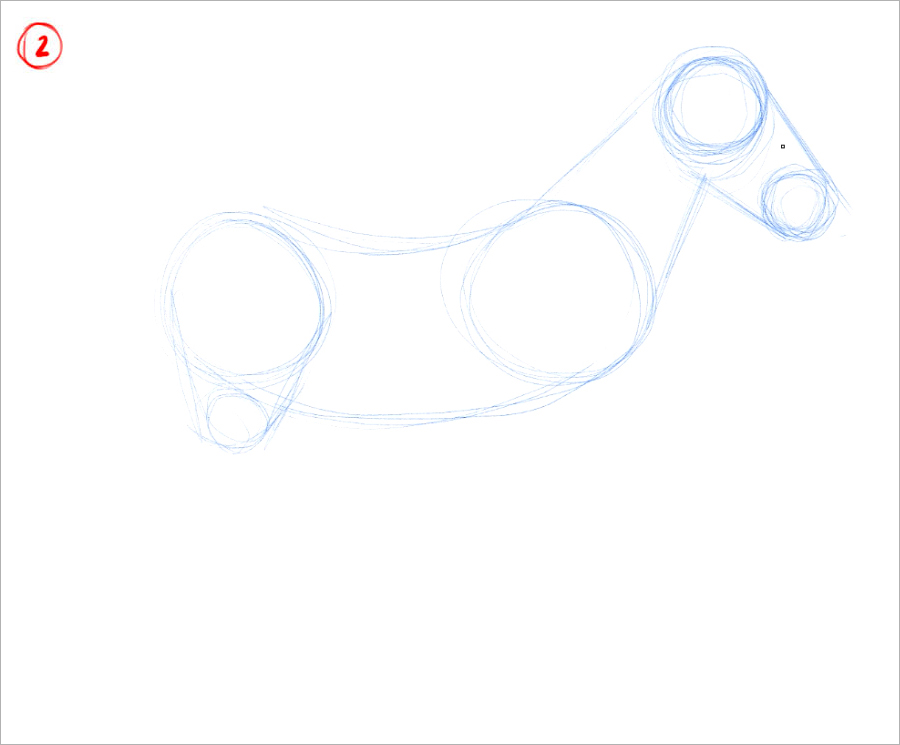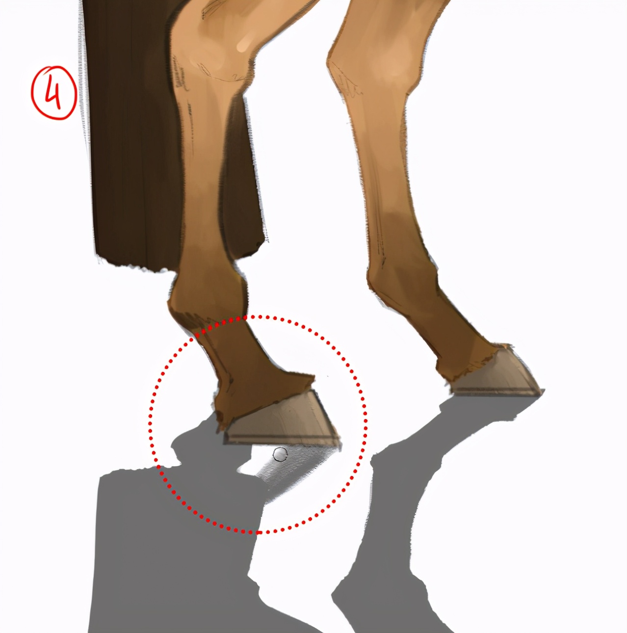 对于后腿,在马的后部下方绘制一个小圆以创建大腿形状,和前腿一样,将后腿绘制成线和圆。这次有两个斜线部分(4)。看看下图。