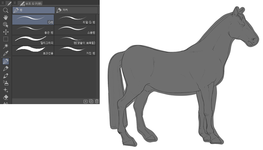 将绘图中的每个过程分成层。第一个是粗略的草图。使用简单的形状(如圆、椭圆、矩形和三角形)绘制成几条线,接近马的解剖结构。从侧面想象一个马。最适合的外观是什么?