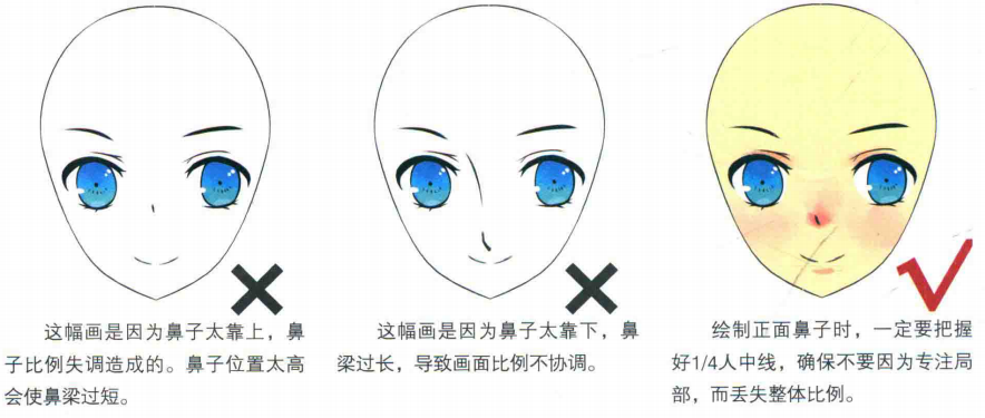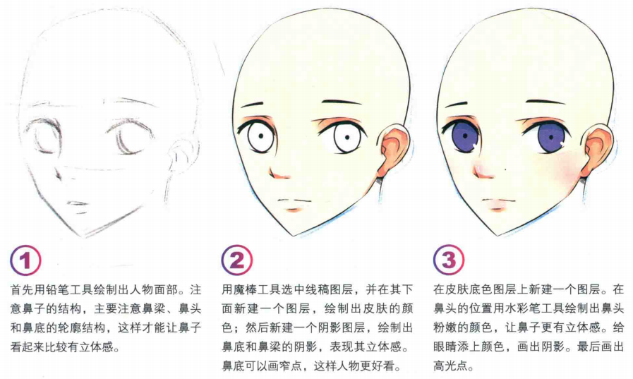 从正面平视的角度来看,鼻梁是看不到的。-般在CG漫 画绘制中,只绘制出一边带状的鼻梁。鼻底画得窄一点看起来会让人物更可爱一些。