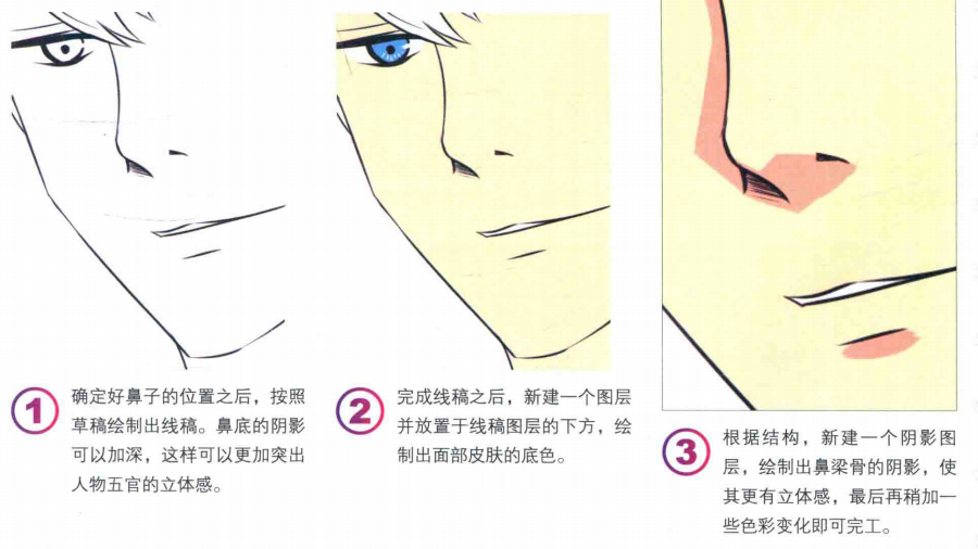 男性角色的鼻子一般比较挺拔,轮廓突出。绘制挺拔的鼻子时不仅要注意鼻子的位置,还要注意鼻子在整个面部中的比例和结构。