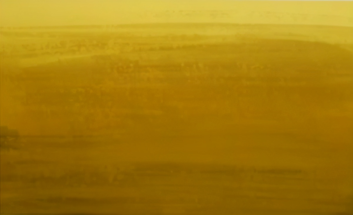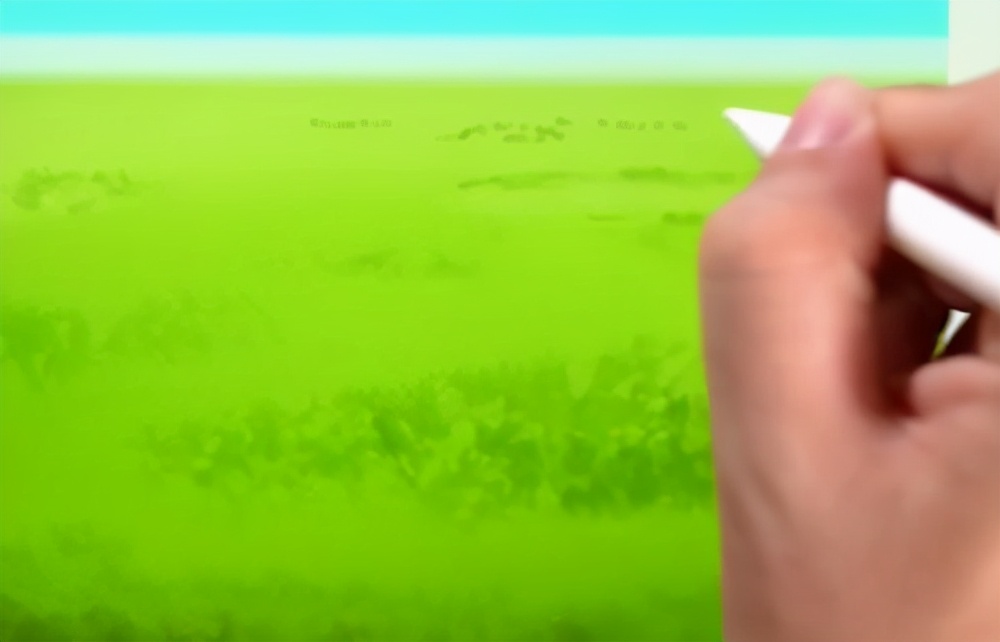 这次,我将在后面绘制天空,因此我将在顶部制作一个蓝色的小部分。越深,草坪的绿色越浅。前景是鲜绿色,略带黄色。我降低了笔刷的不透明度以创建渐变。