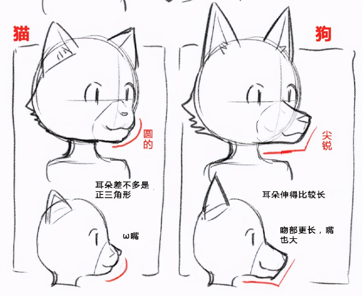 另外,作为基础先要知道画猫和狗的时候,有哪些区别是要重点了解的。