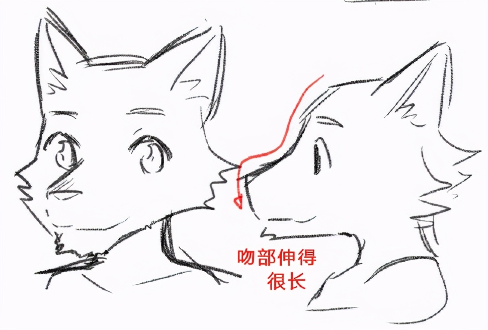 吻部画得很明显,凸出动物感,更多用在成人男女上.要注意虽然吻长了脖子还是连在后面。