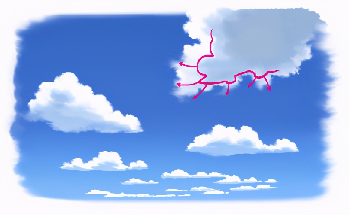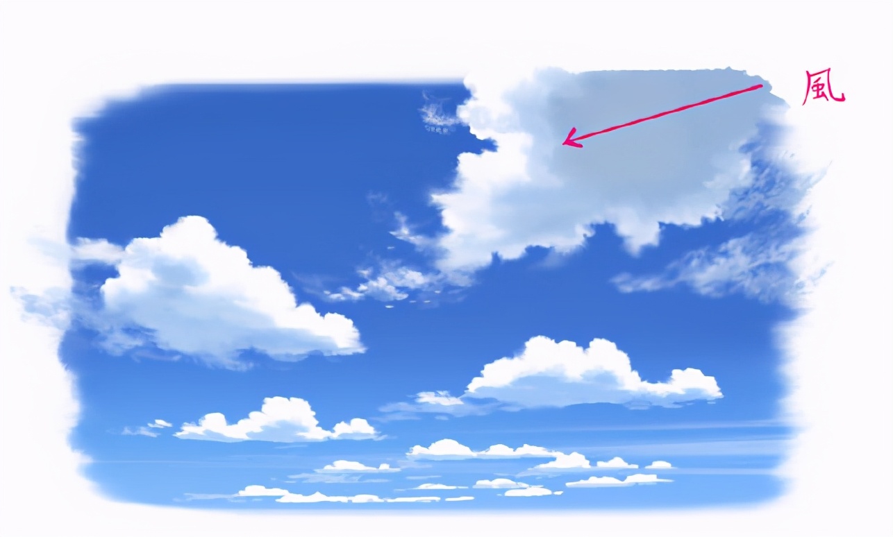 这里额外展开。想定风从右边吹过来,添上从大块云中吹出来的散云。在边缘的散云,可以体现存在于画面外的云,拓展画面。