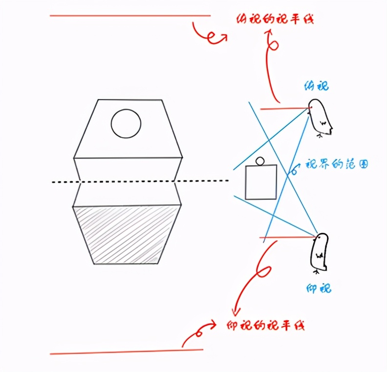 视平线,决定了视点的高度,视平线在上方,整个图就会有俯视的感觉,在下方则是仰视。位于人眼的正常高度则会带来身临其境的感觉。