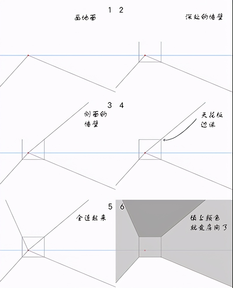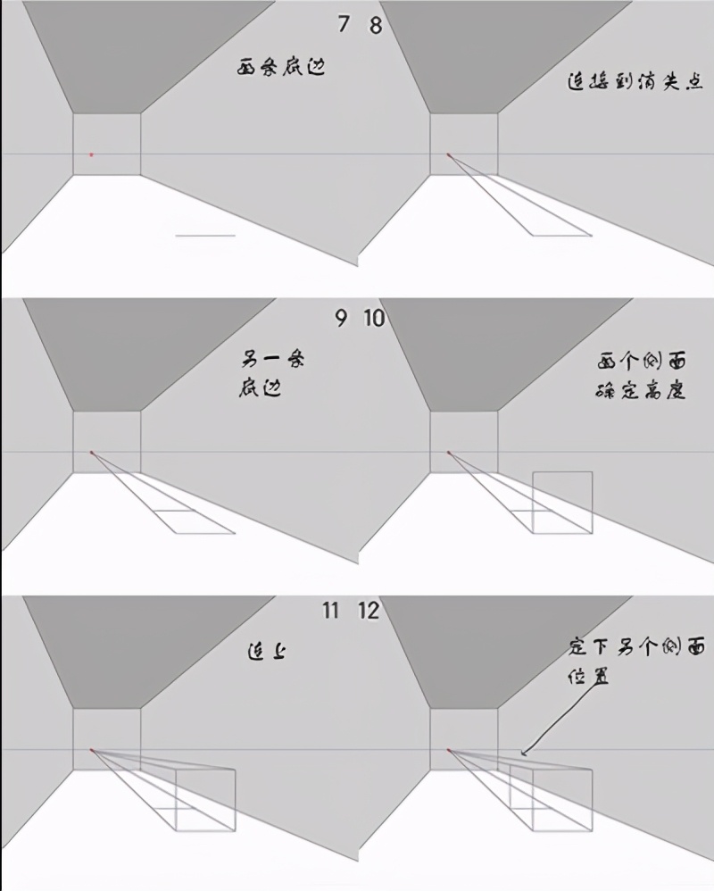 先定下视平线和消失点的位置,事先打一下背景的草稿就很容易确定了