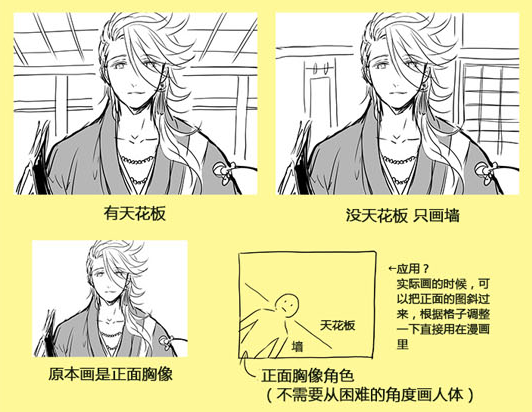 天花板和墙的交界出画出来,看着就像是仰视构图了胸像图也可以用。特殊角度的透视、人体画不出来也可以简单表现地仰视