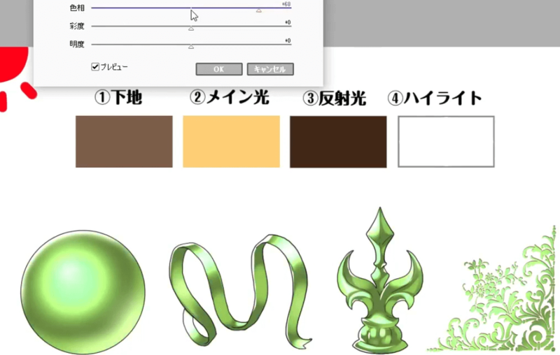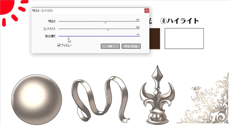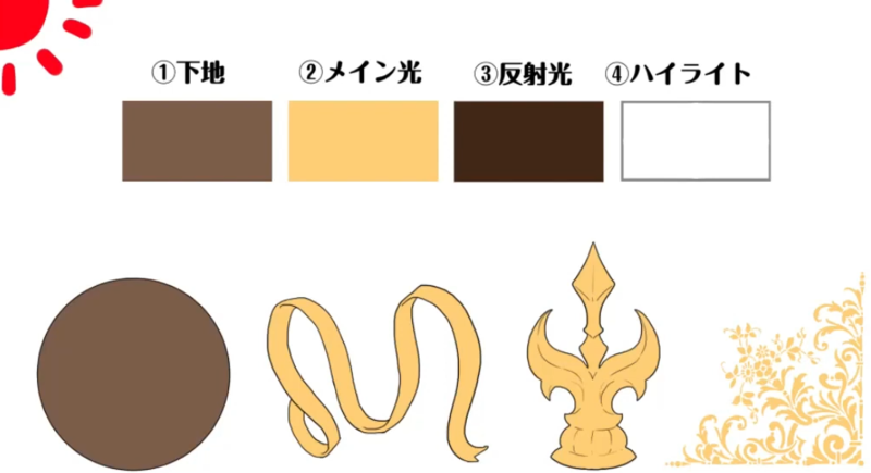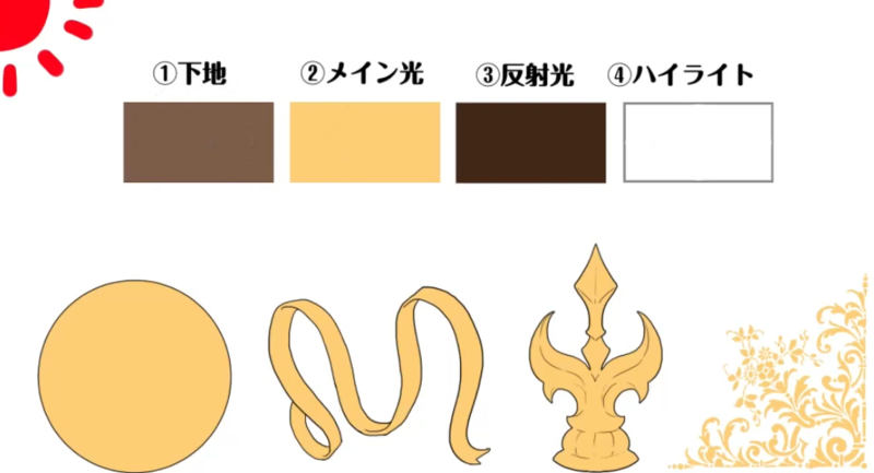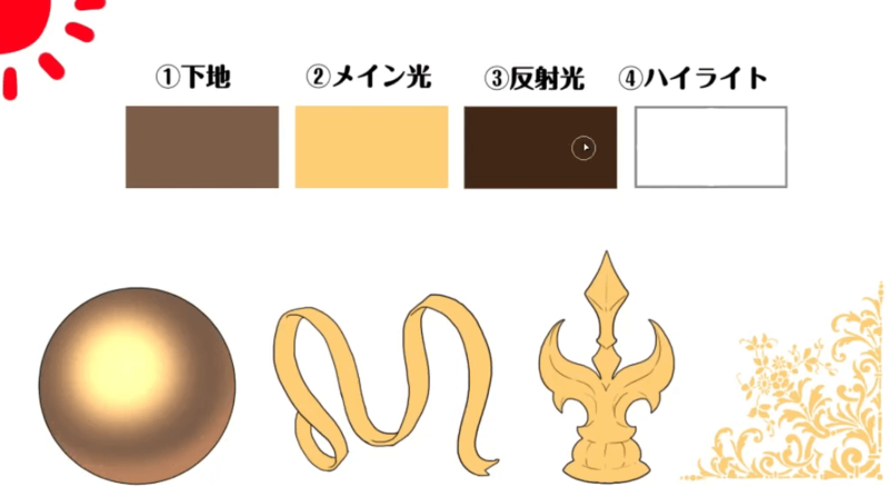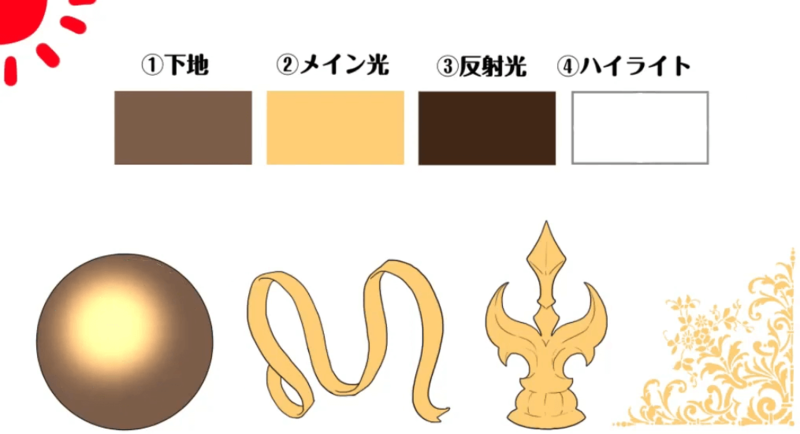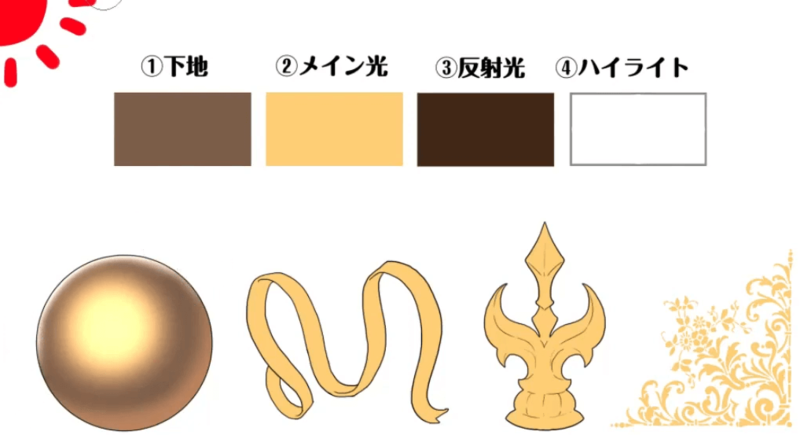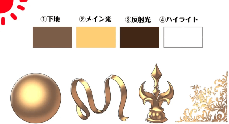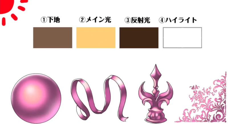在步骤至中施加金属。这次,我将重点关注图中的球体来说明如何绘画。