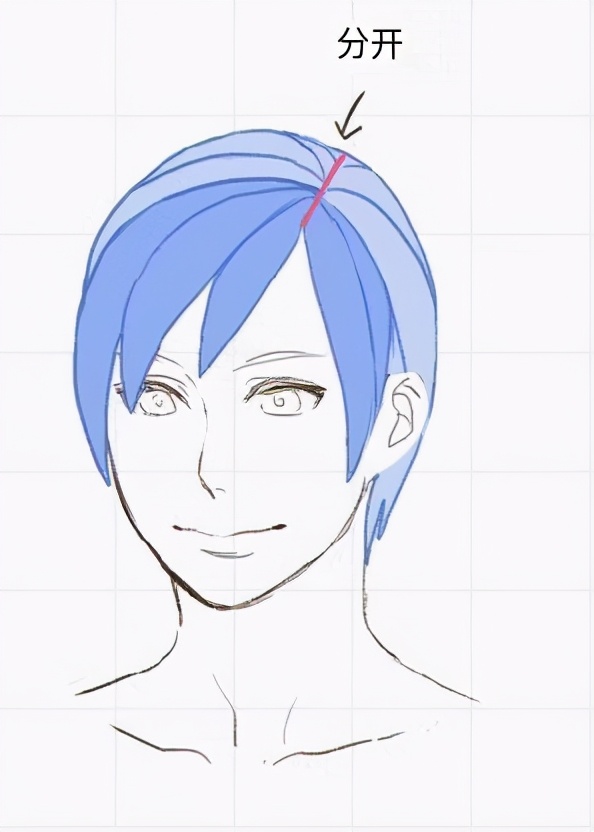 因为是分开考虑后发的类型,所以大致是按照颜色来区分,首先明确分开的位置,然后按照头的形状是刘海部分,之后是后发的顺序。