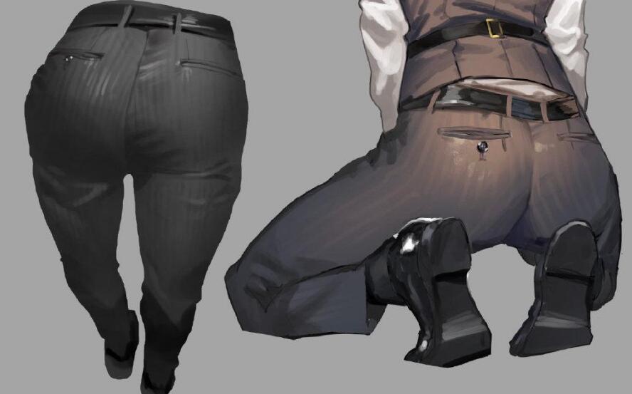 首先,想要画裤子,就得先了解臀部和腿部的结构,而且西裤属于比较光滑的材质,所以它的高光会比较多。了解到这些后就可以开始画西裤啦
