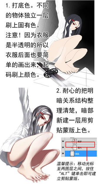 1、打底色。不同的物体独立一层刷上固有色。注意!因为衣服是半透明的所以衣服后面也要简单的画出来,起码刷上颜色。