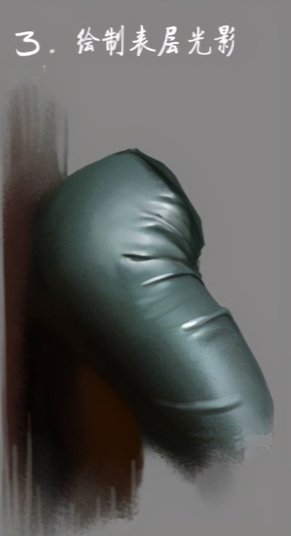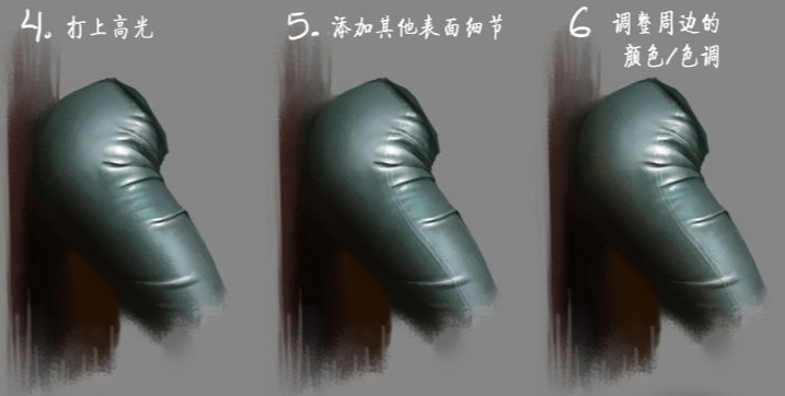第一步画的基本材质要一直保留到最后,这样会给布料一种真实的质感漆皮反光,不止能反射光源,甚至有的周边的事物的颜色和形状也能镜面映出来,这取决于具体的材质。