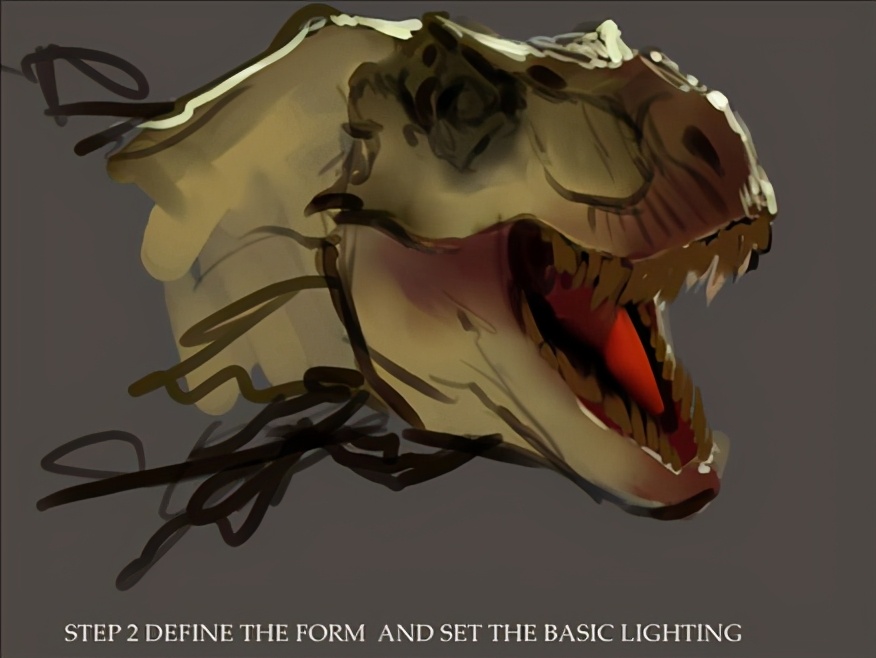 进一步渲染明暗关系,开始处理头部结构,之前要积累一些恐龙头骨的解剖素材,好找准头部主要转角和转折面。同时处理明暗过渡: