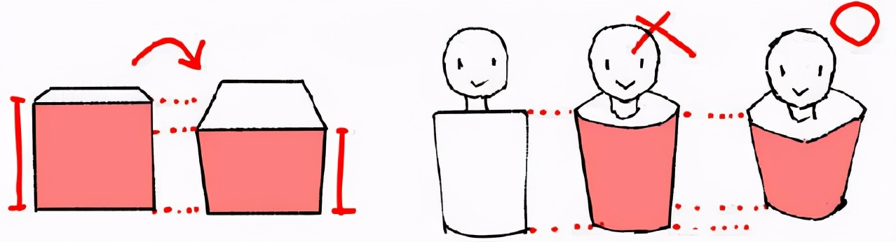身体上方的面看到得越多,侧面就看到得越少,将正面缩小。