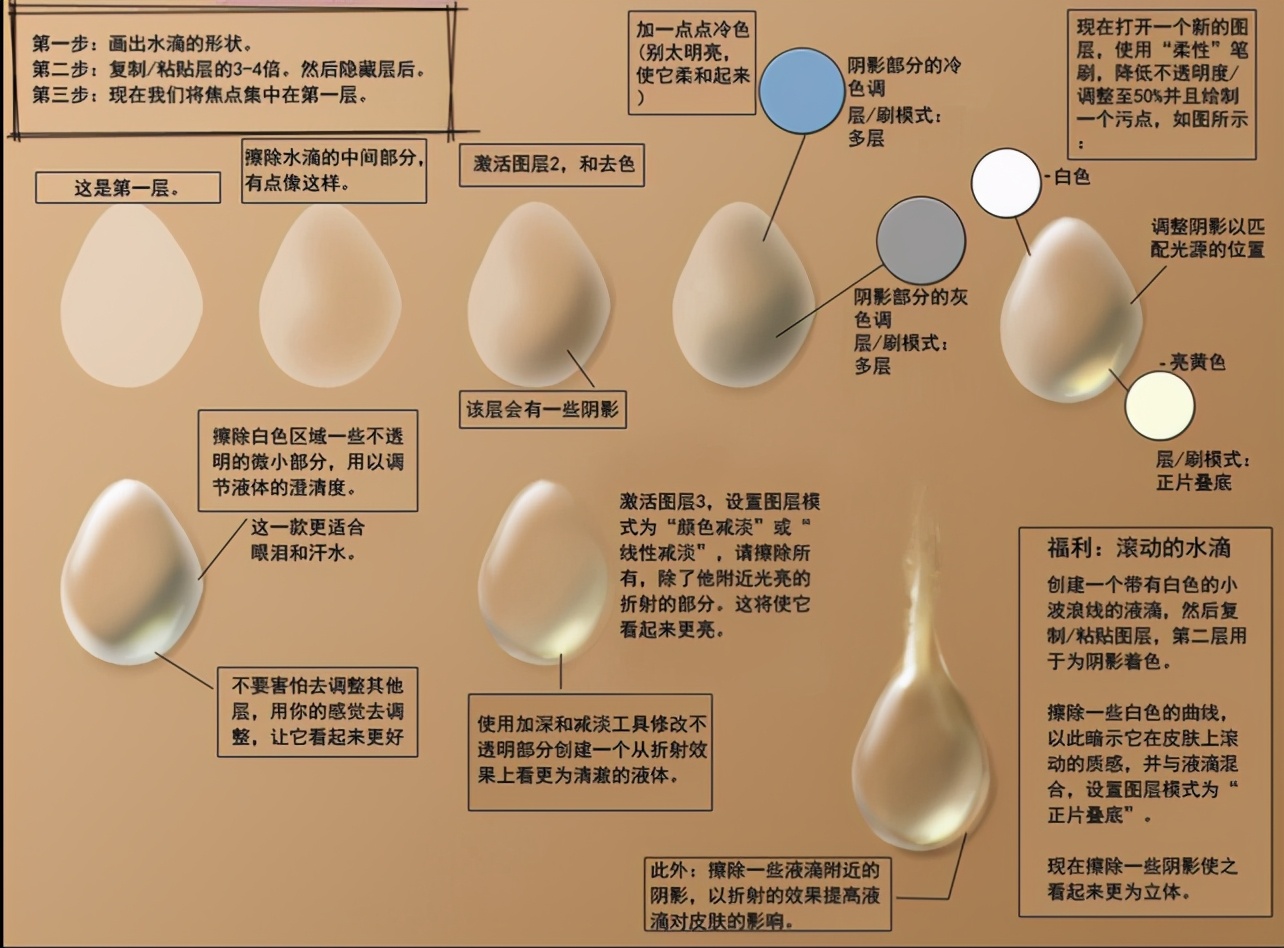 创建一个带有白色的小波浪线的液滴,然后复制/粘贴围层,第二层用于为阴影着色。操除一些白色的曲线,以此暗示它在皮肤上滚动的质感,并与液滴混合,设置困层模式为租正片叠底”。现在擦除一些阴影使之看起来更为立体。
