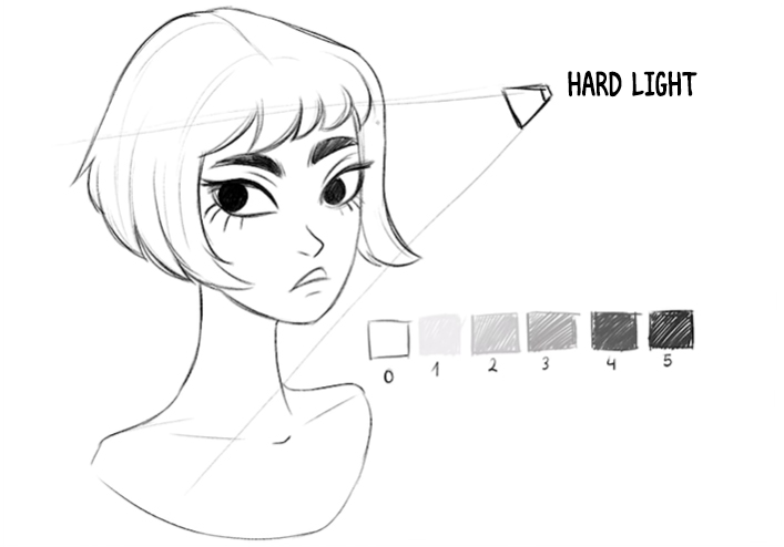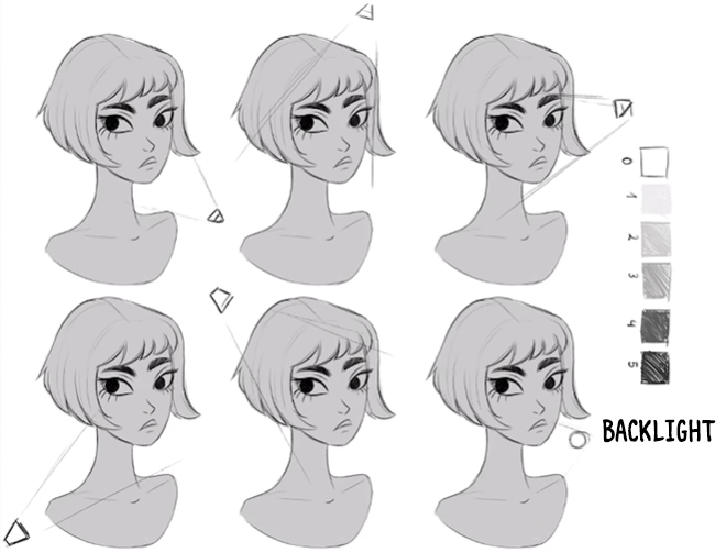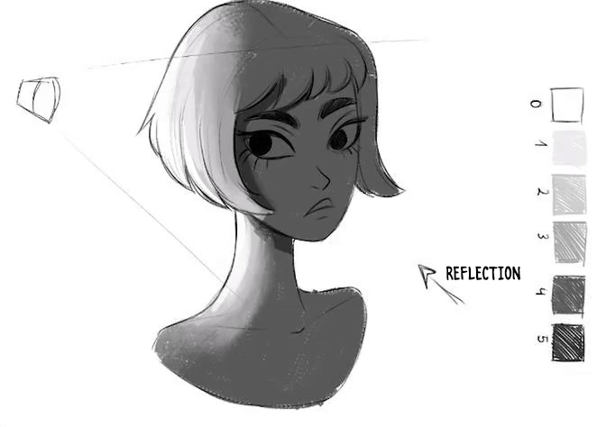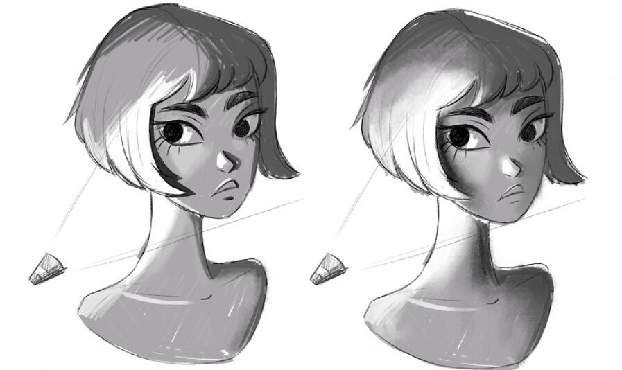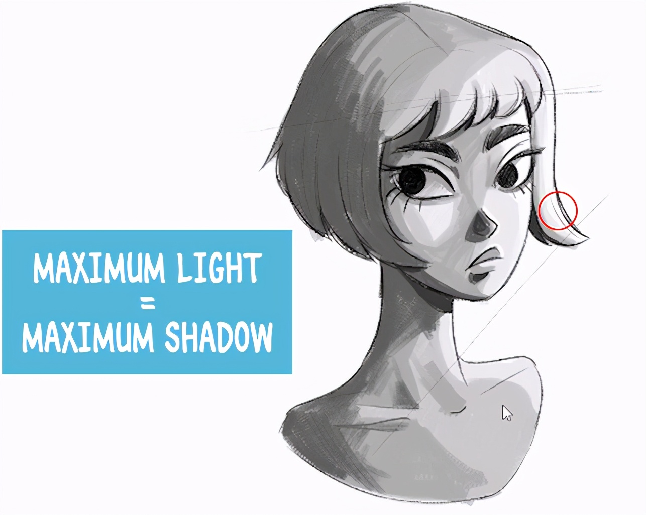 正如你在下面的图片中所看到的,阴影比高光更远离光源。此外,为了增加绘图的深度,我们也应该考虑到突出或有体积的部分,如头发、下巴、鼻子或下唇。
