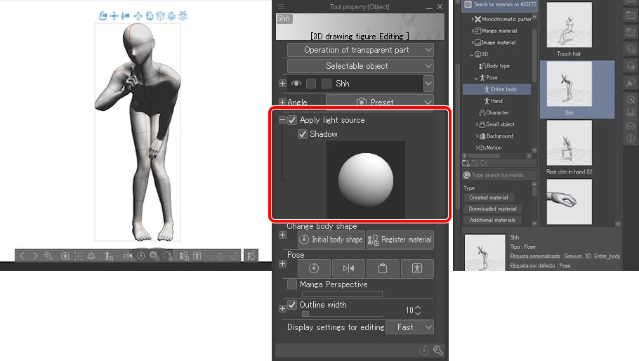 剪辑工作室涂料用户也有工具,使任务更容易,如3D图形,你可以自动阴影在任意改变光源的位置,身体形状和姿态。一旦在画布上有了三维图形,就可以从工具特性调色板>应用光源。要编辑光源的位置,只需拖动下面图像中红色圈的球体即可。设置这些数字的照明可以很好地参考初学者,或者如果你需要一个特别复杂的姿势。