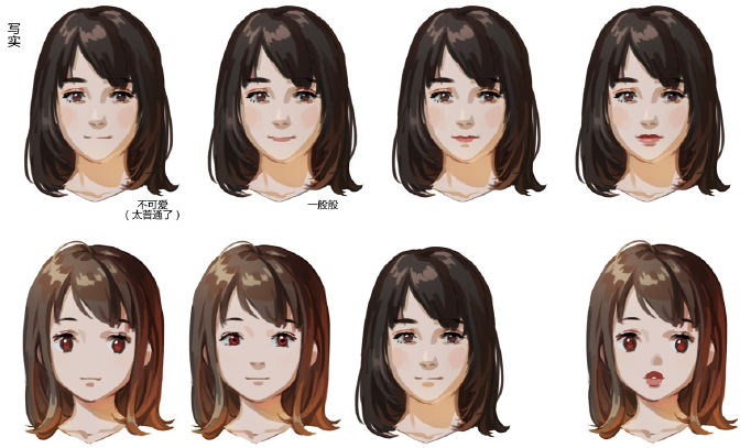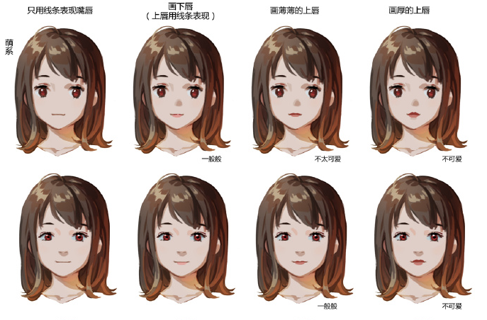 写实风以外,画了嘴唇就不太可爱了。特别是上唇.....嘴唇和萌系画风不太合的样子。萌风无论如何都要画嘴唇的话,只画下唇比较好。下唇颜色画得比较淡也还行。