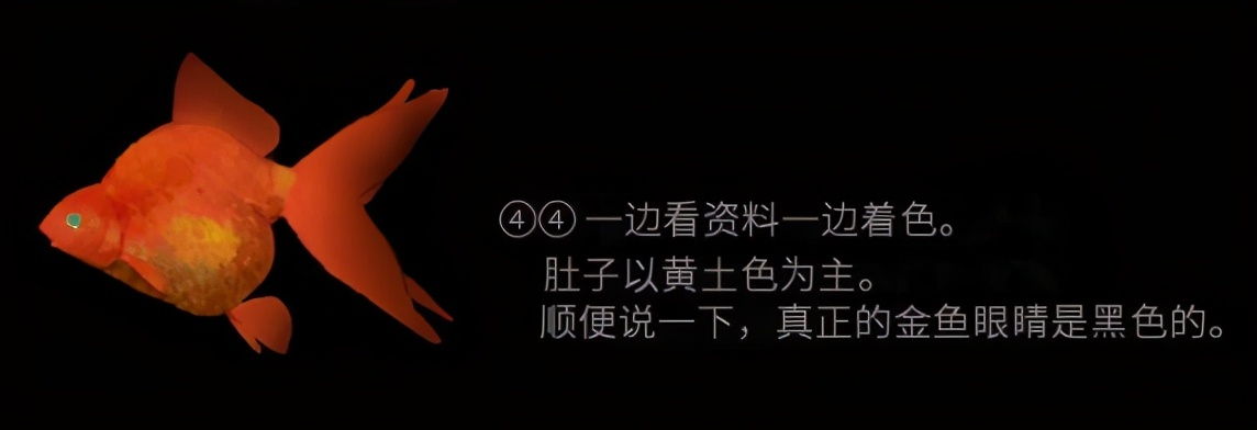 一边看资料—边着色。肚子以黄土色为主。顺便说—下,真正的金鱼眼睛是黑色的。