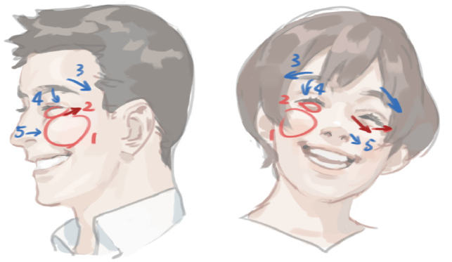 把1和2去掉/画错肌肉走向以后,笑容会衰减很多,甚至变假(卧蚕非常重要)