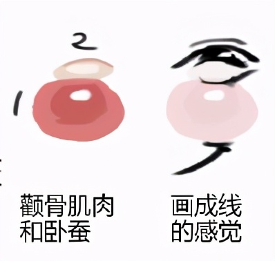 2、卧蚕隆起,盖住眼珠,一定要是往上的弧度这部分肌肉拉伸方向见红箭头,1和2互相挤压
