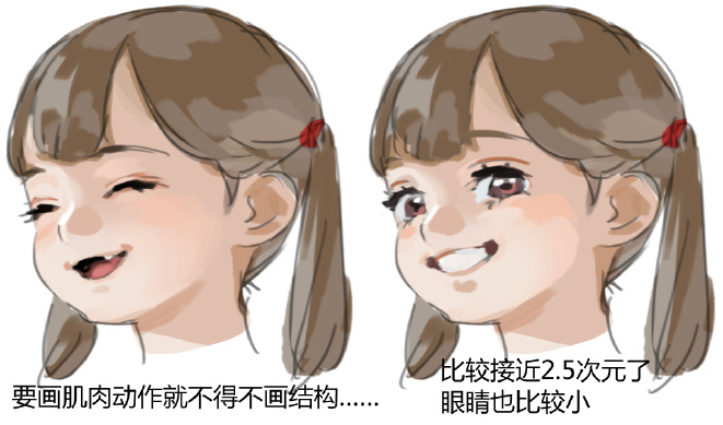 二次元可以表现的肌肉比较少(比如没有卧蚕),嘴巴也比较小,没鼻子,表现力比三次元弱,画不了大笑......