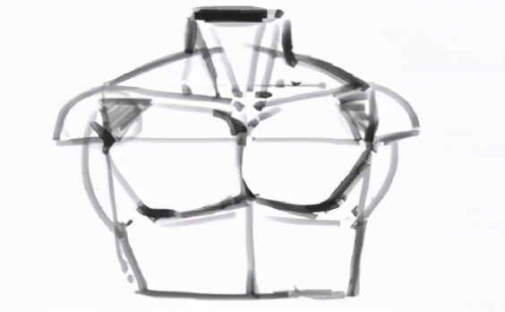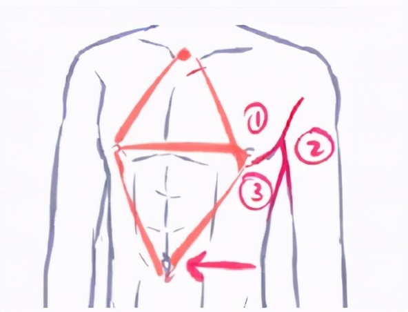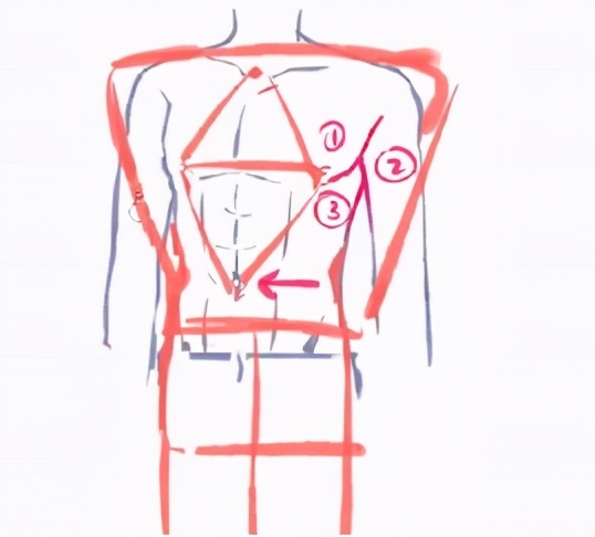 4、男性从锁骨中间到乳首是一个等腰三角形,从乳首到肚脐是一个略方的等腰三角形;
