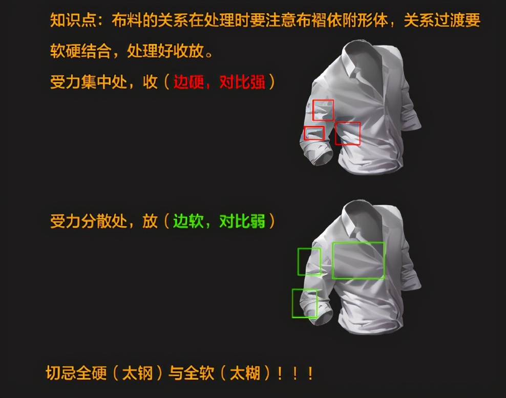 TIPS:知识点:布料的关系在处理时要注意布褶依附形体,关系过渡要软硬结合,处理好收放。受力集中处,收( 边硬,对比强)