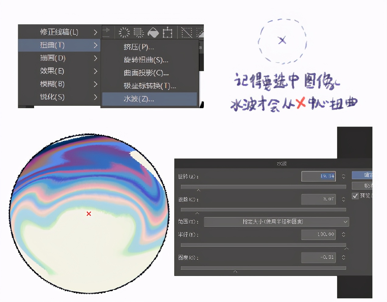 4、按住Ctrl点击图层,选中图像后打开"滤镜”选择扭曲里的水波,会变成下图这样