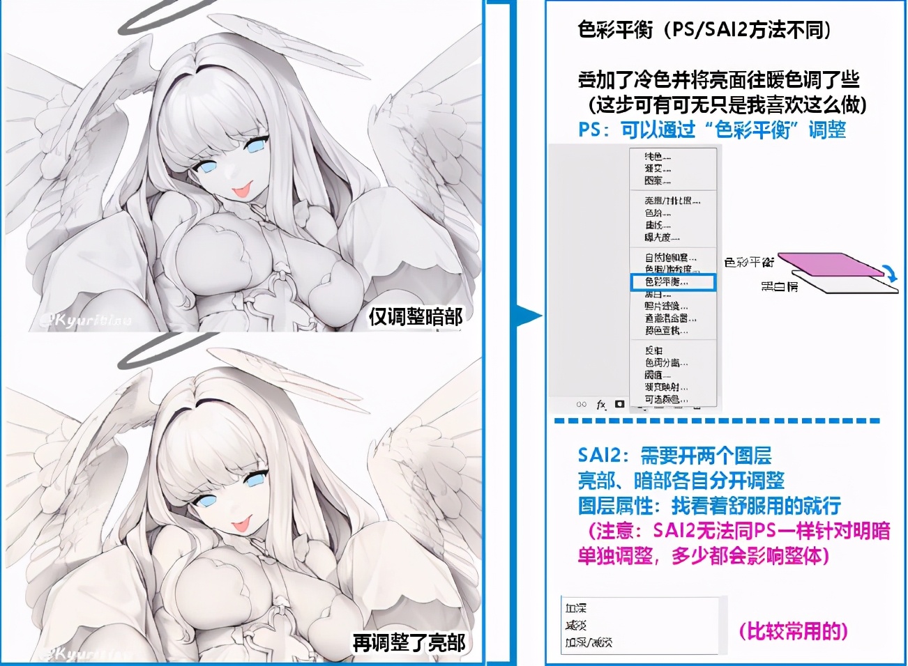图层属性用着舒服就行,是因为在SAI2中每次用的不一样,但凡是能调整色彩的都可以用.而PS中的“色彩平衡”可以直接调整亮部暗部的色相。