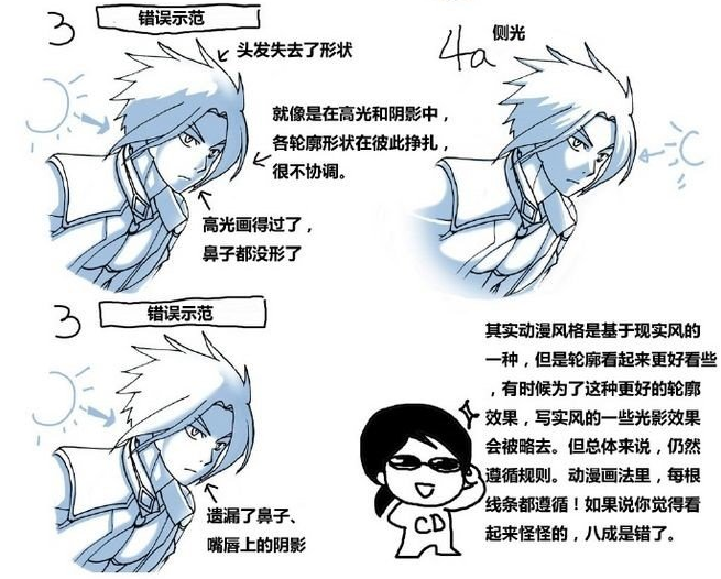 其实动漫风格是基于现实风的一种,但是轮廓看起来更好看些,有时候为了这种更好的轮廓效果,写实风的-些光影效果会被略去。但总体来说,仍然遵循规则。动漫画法里,每根线条都遵循!如果说你觉得看起来怪怪的,八成是错了。