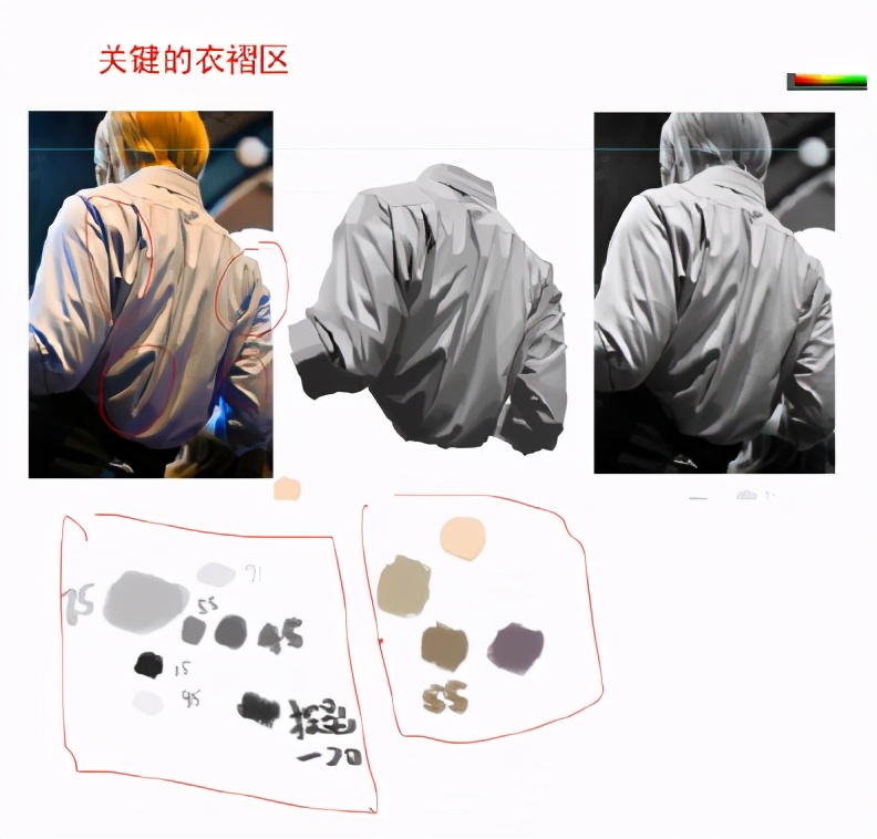 这样在有了和素描五阶对应的色卡后,就只是填色和优化各阶级形状(三的定理)而已