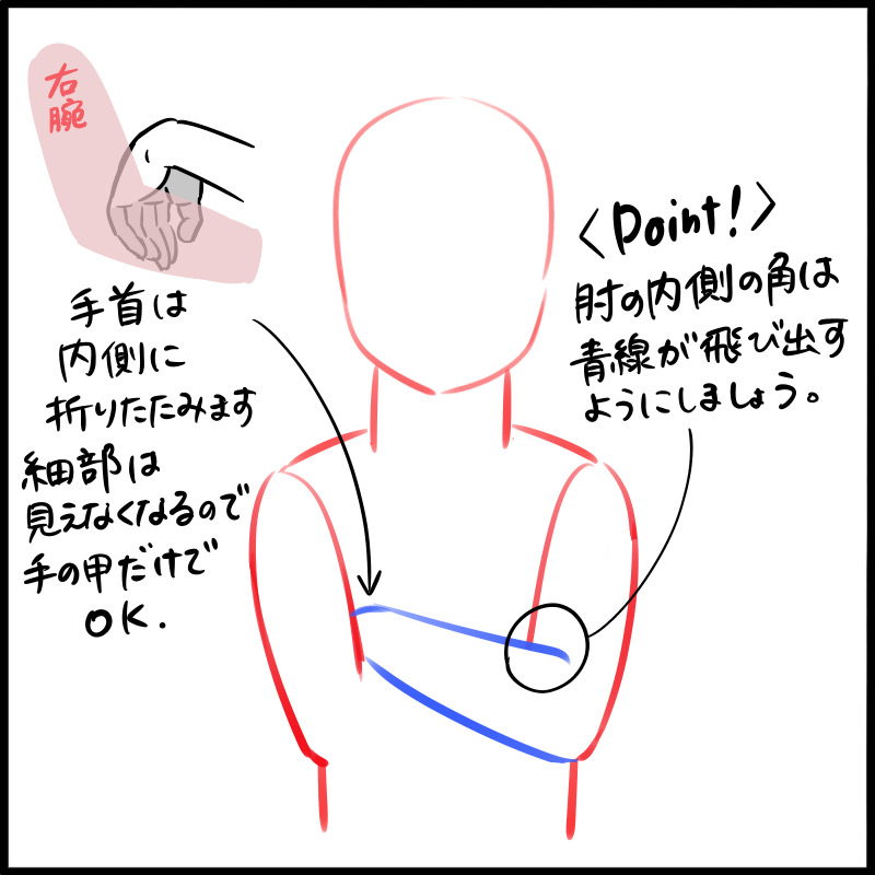 如果你向右臂肘部的内侧画,手腕应该是折进去的。