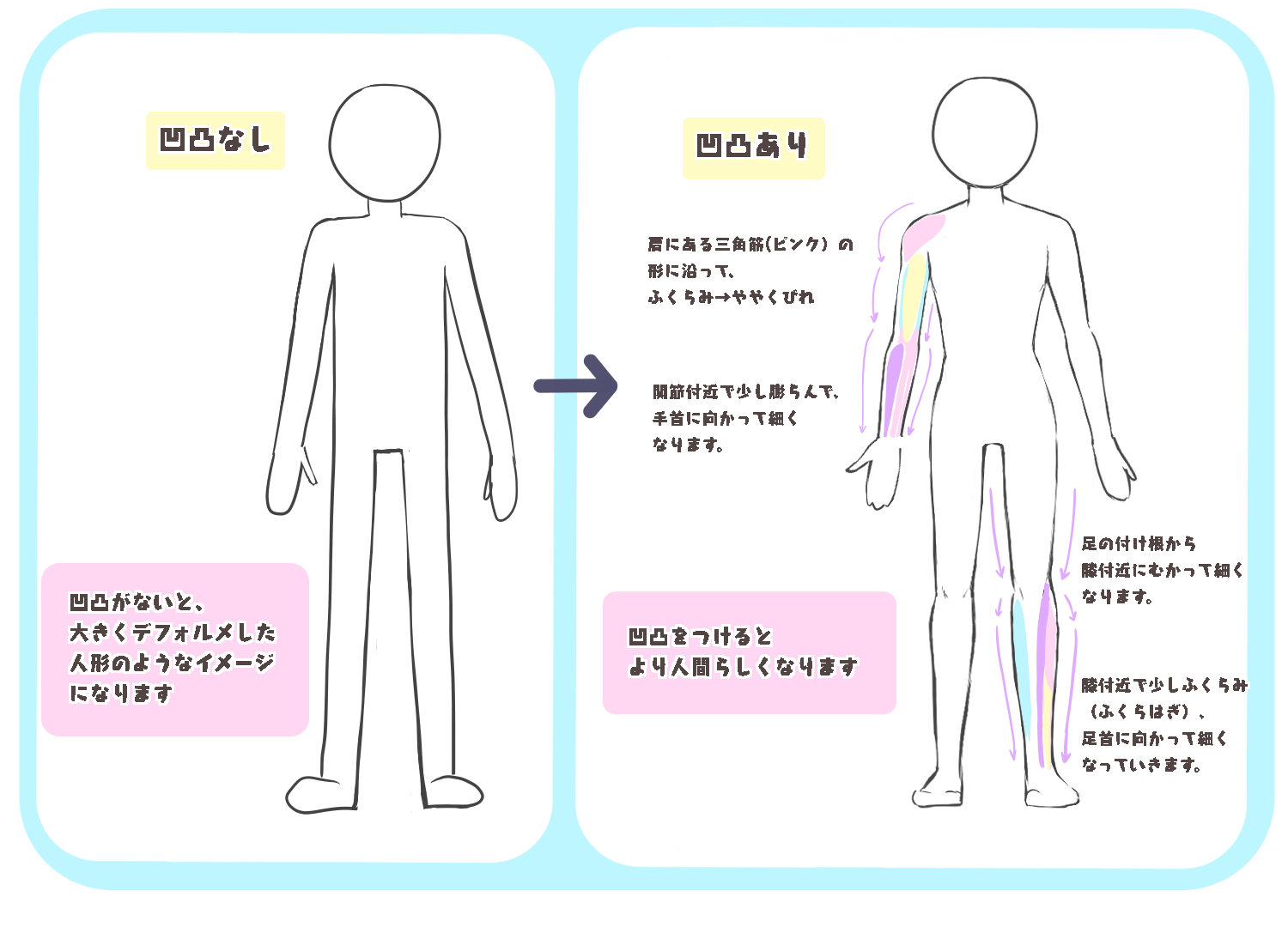 一开始,只要记住如何画出基本的凹凸感,如下图所示,就足以让人物看起来很人性化。