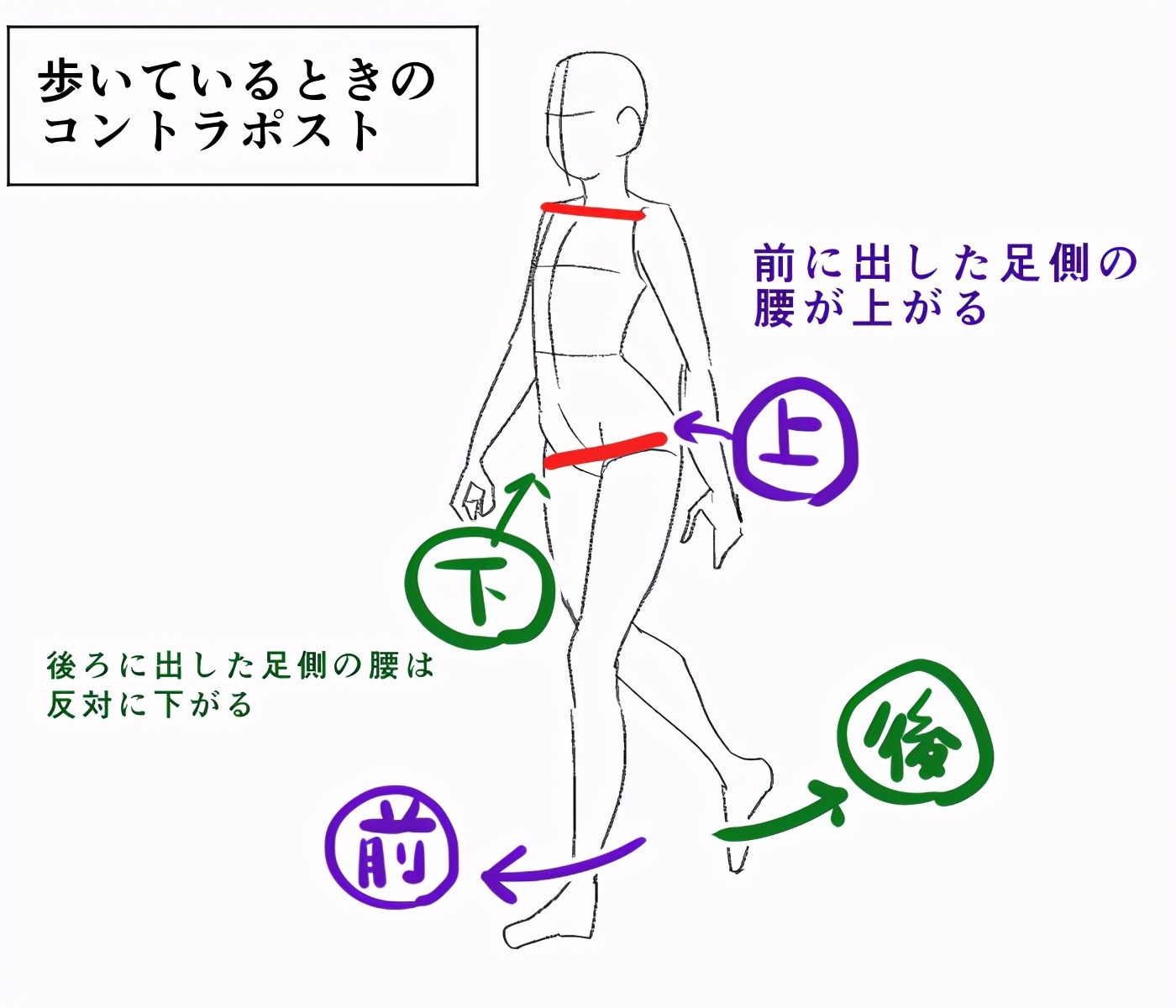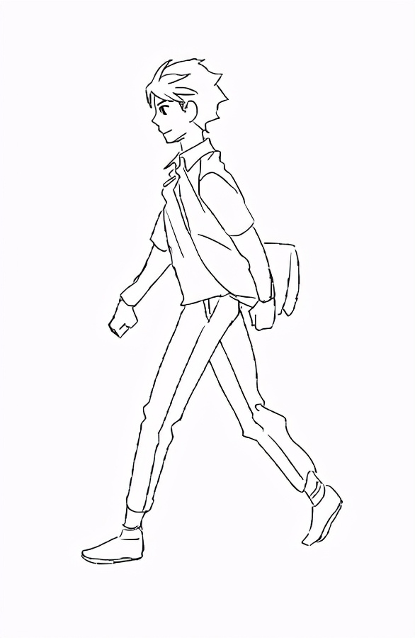 对于行走的身材,诀窍是腿侧的腰部在前面向上画,腿侧的腰部在后面向下画。