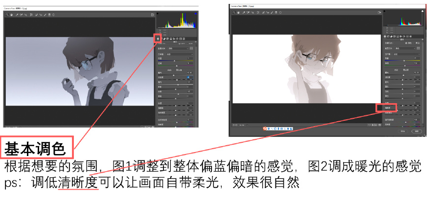 根据想要的氛围,图1调整到整体偏蓝偏暗的感觉,图2调成暖光的感觉ps:调低清晰度可以让画面自带柔光,效果很自然