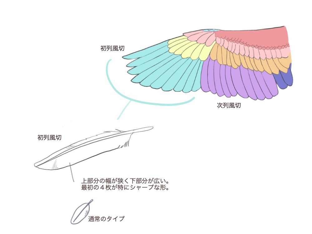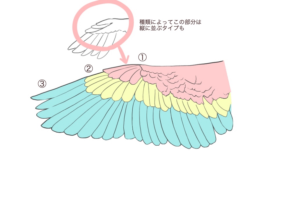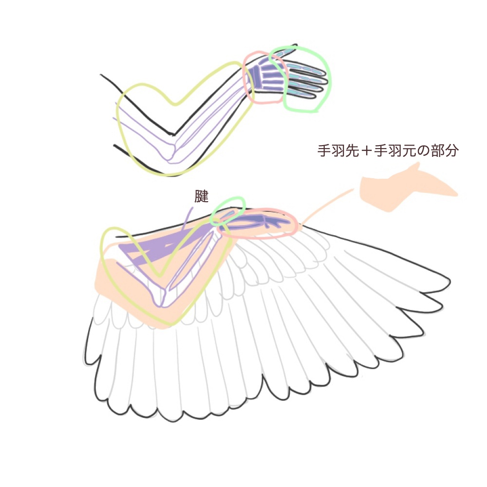 在画翅膀的时候,如果先把这些骨架和骨架肉化的部分(翼尖+翼基部分)画成粗略的草图,然后再在上面加上翅膀,就比较容易得到形状。