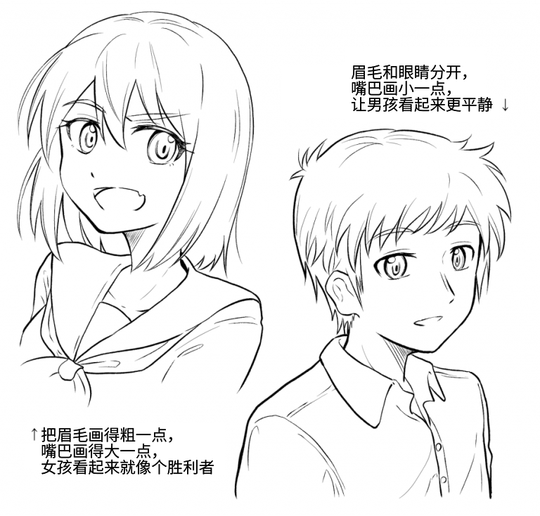 如果你能记住这些特点,就可以利用这些特点,结合男女双方的特点,创造出 “阳刚的女孩 “或 “温柔的男孩”,如下图所示,这将大大扩展人物的表现范围。