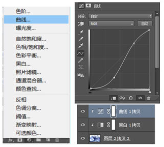 因为我们后面要用到置换滤镜,我的个人理解置换其实置换的是明暗度。所以再在上面拉一个曲线,微调,让明暗关系稍微强烈一点